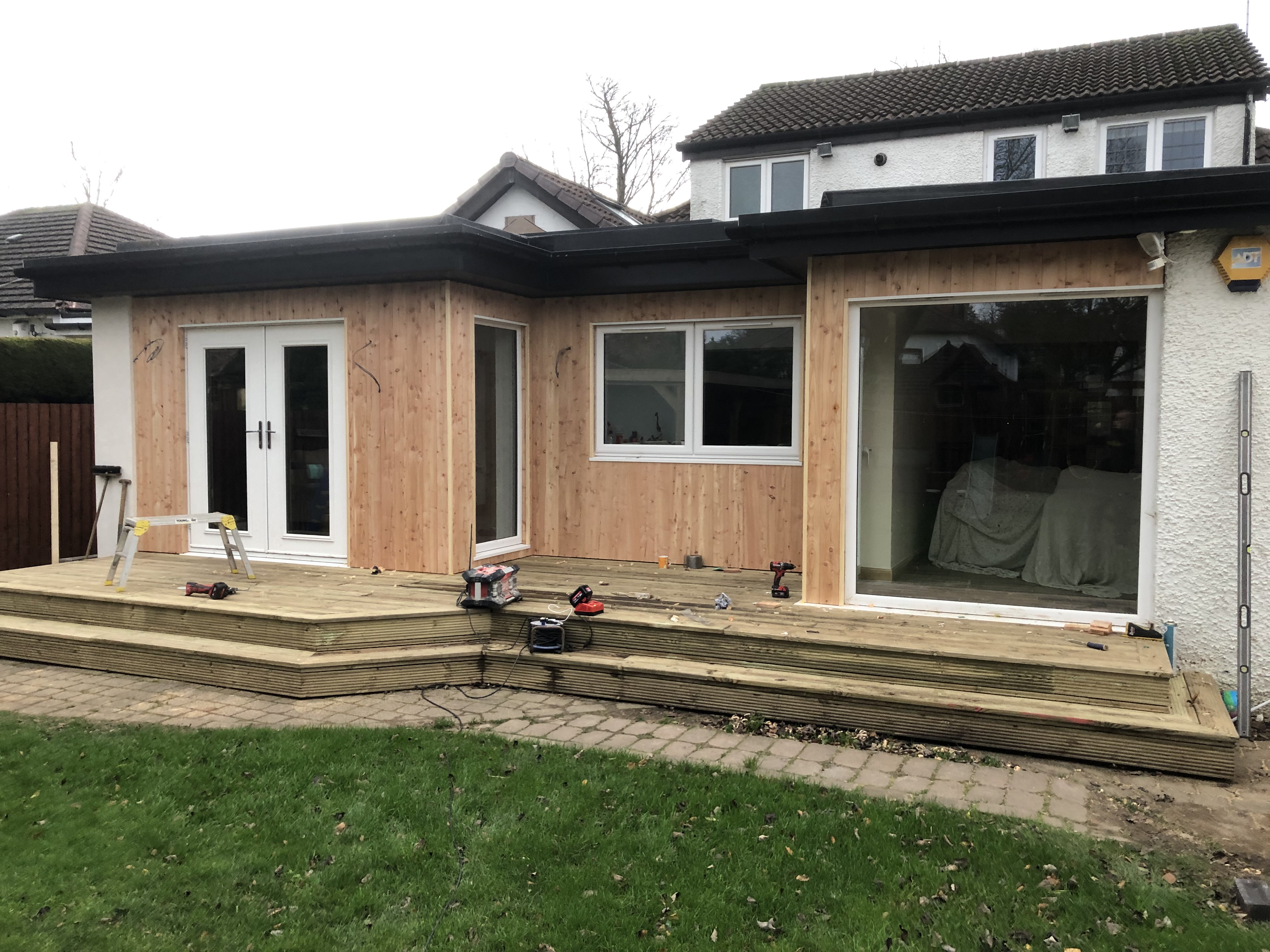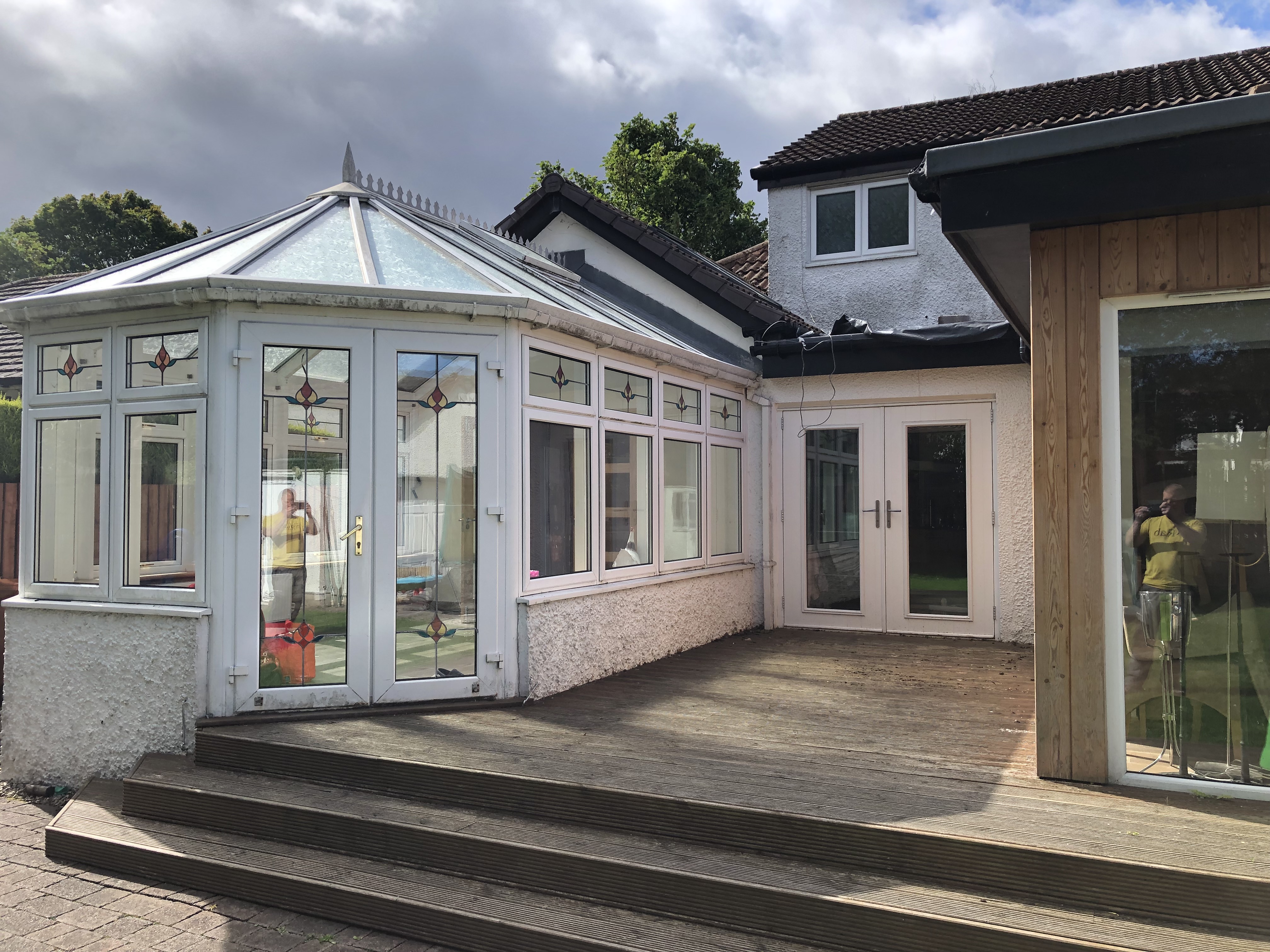 Demolition of conservatory (second image) followed by construction of larger extension to create symmetry and an extended living area off the kitchen. Installation of decking, cladding of the extension with Scottish larch. Bearsden, Glasgow.
