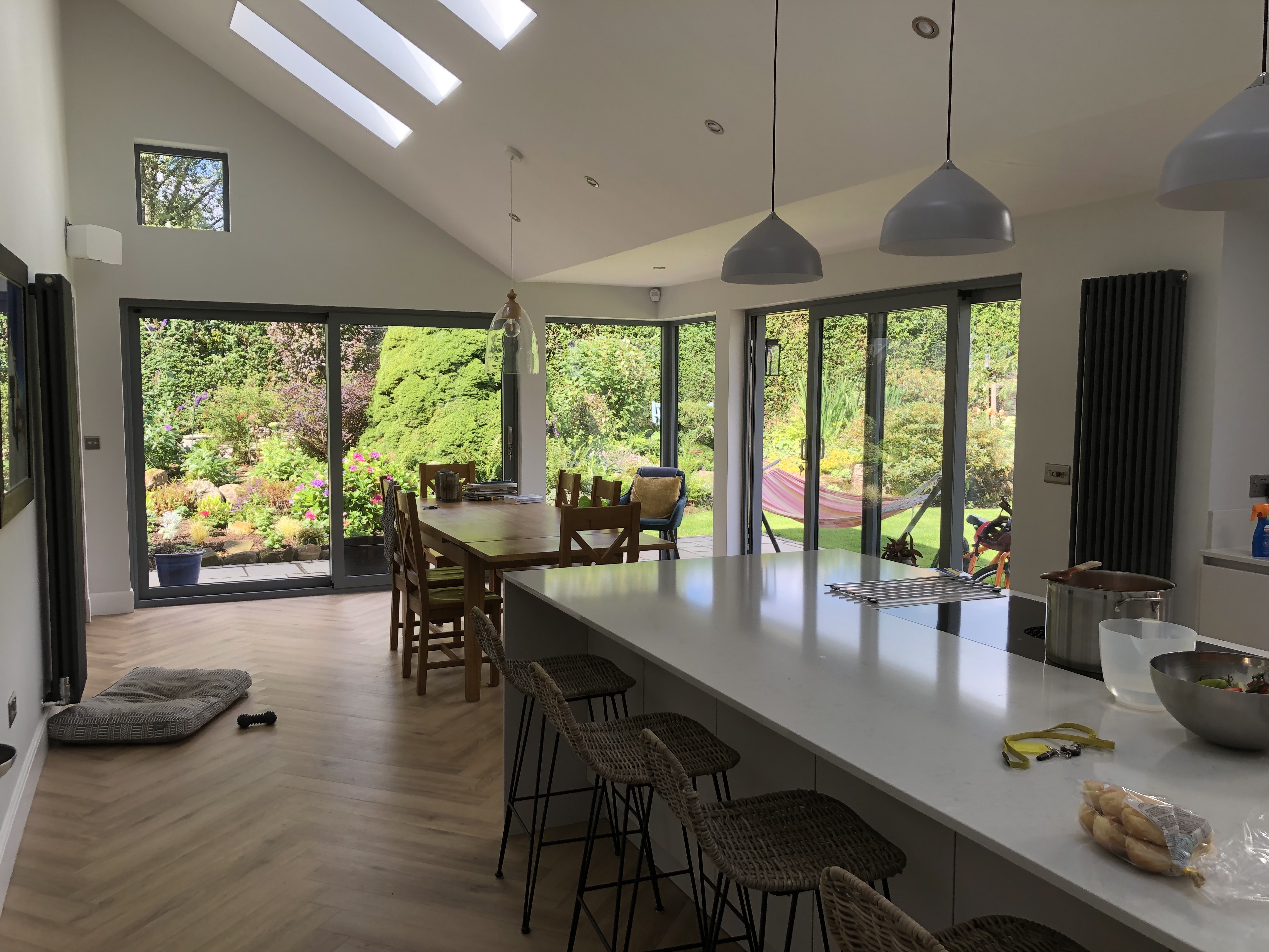 Construction of a wraparound extension with large sliding doors to create a light-filled kitchen/living area in Bearsden, Glasgow.